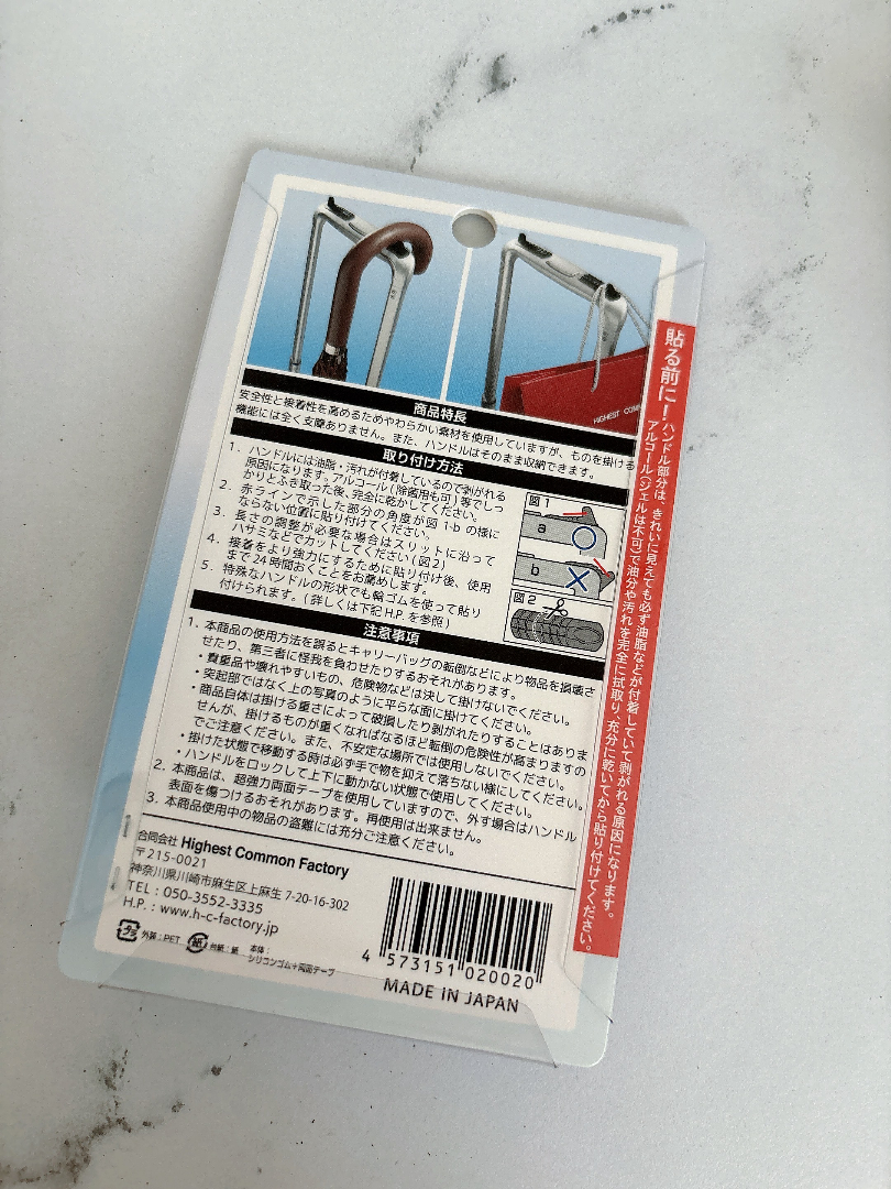 キャリーバッグのハンドルが細くかなり小さく切って貼り付けたのと、ハンドルが斜めになっていたので平らに貼れなかったので荷物を引っ掛けたときの耐久性が不安でしたが実際とても重宝しました。両手が使え、また掛けた荷物が落ちることもなくこれまでのストレスが解消されました。余談ですが突起部分を掌で押さえるとツボ刺激にもなりました!(50代女性)