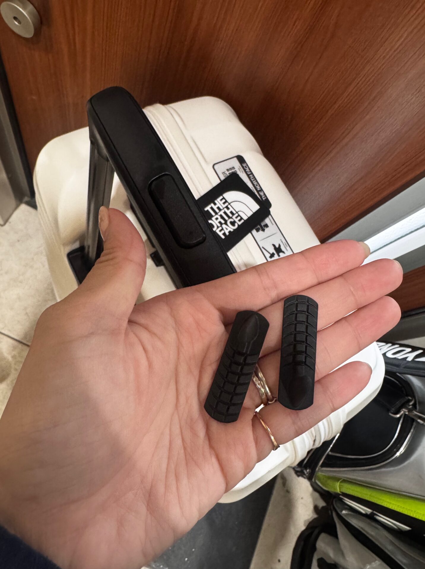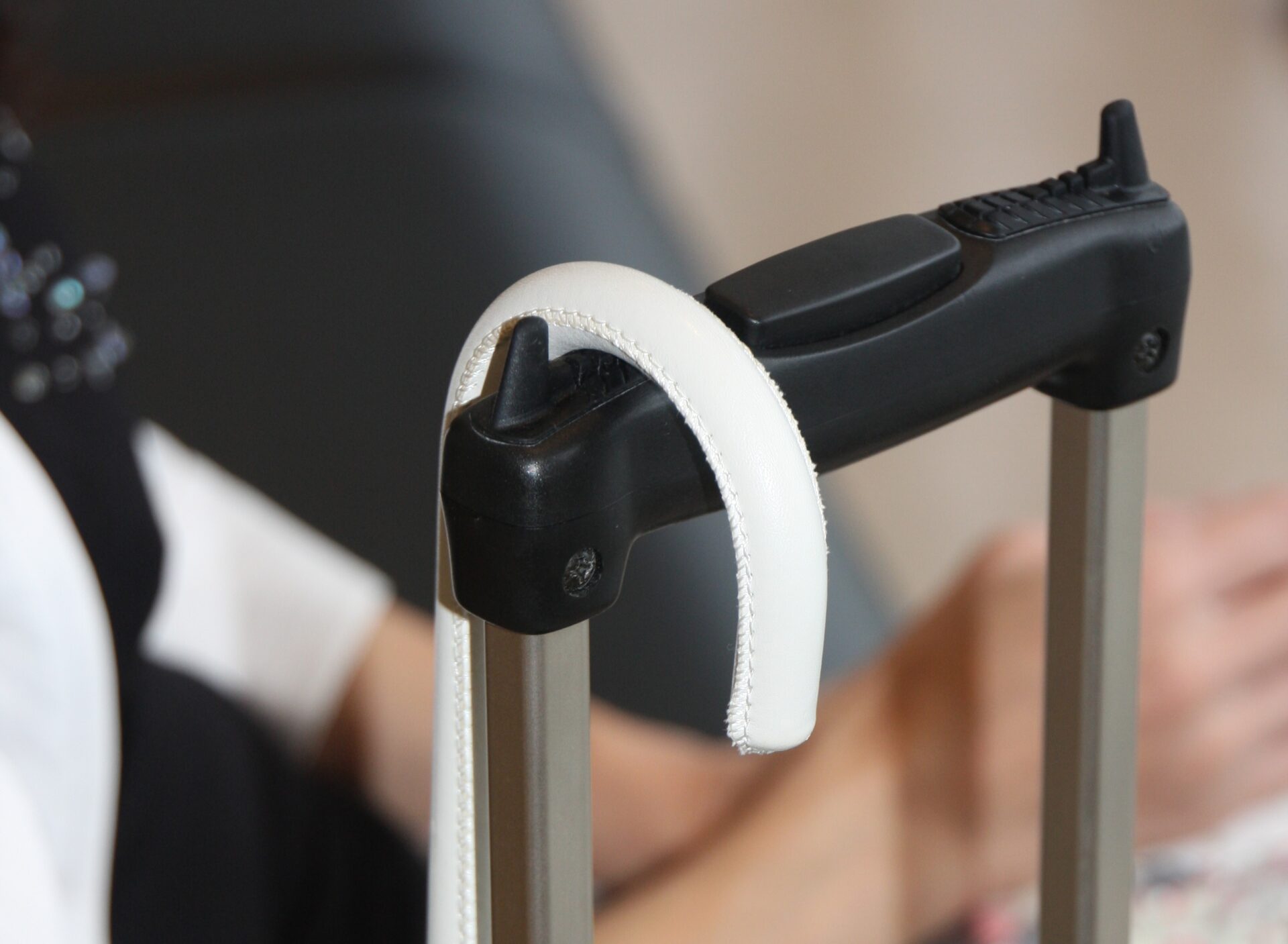 キャリーバッグのハンドル部分の両端に簡単につけられる、突状(山)型のアタッチメントを開発しました。