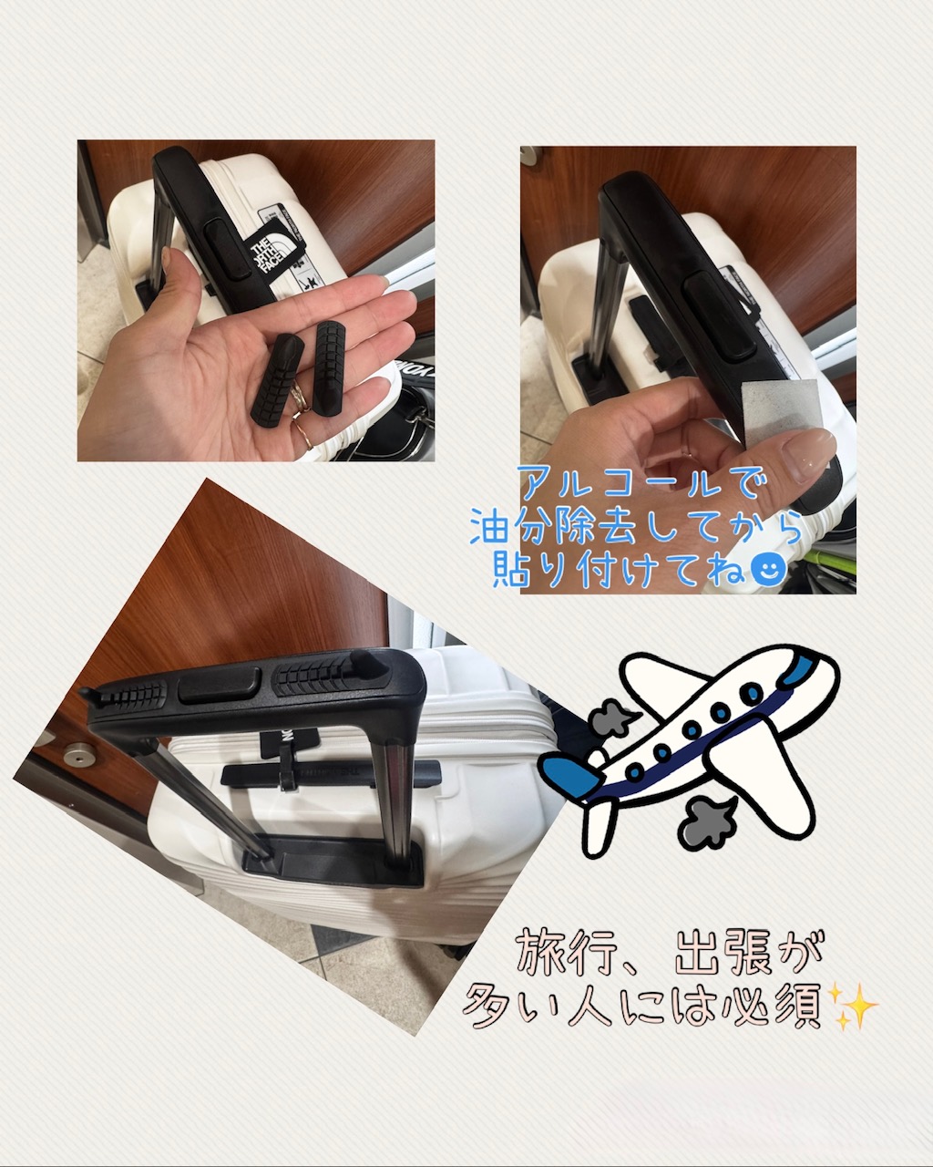 説明書通りに貼ったらバッチリです 私のスーツケースはグリップの部分が少しカーブしていますが、ちゃんと接着しています。 運ぶ時、滑り止めの役割も果たしてくれるので、安心です。(30代女性)